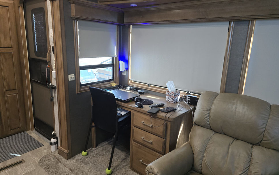 Powered Lazy-Boy recliners and a custom Santa Fe/Houston-style desk integrated into the slide-out